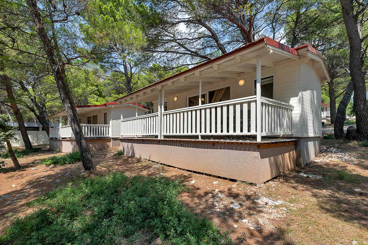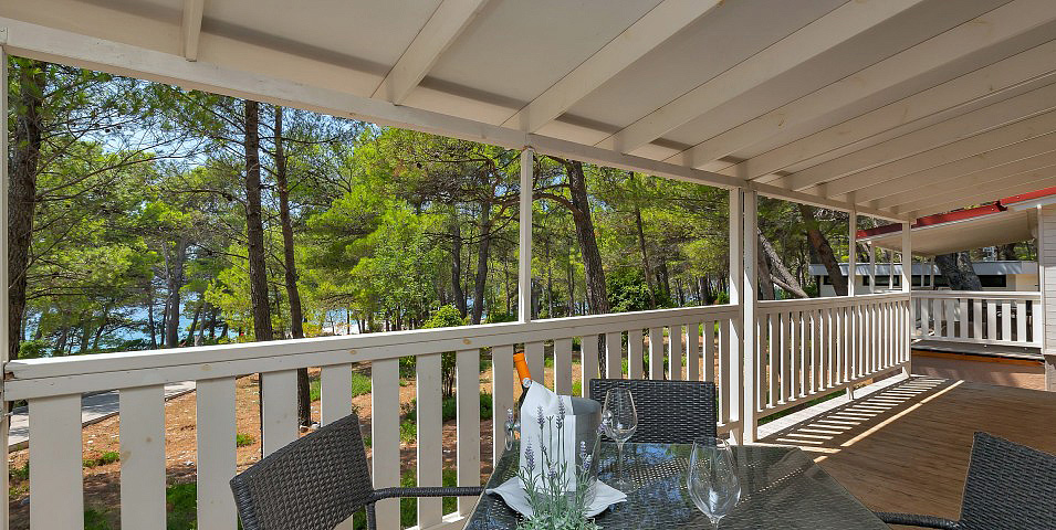 24 m² -1 sypialnia z łóżkiem małżeńskim, 1 sypialnia z 2 łóżkami pojedynczymi, pokój dzienny z w pełni wyposażonym aneksem kuchennym, łazienka z prysznicem, zadaszony taras z meblami ogrodowymi