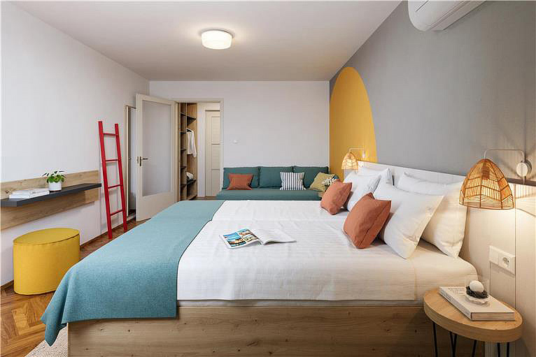 pokój z łóżkiem małżeńskim i dostawką w formie rozkładanej kanapy, łazienka z prysznicem