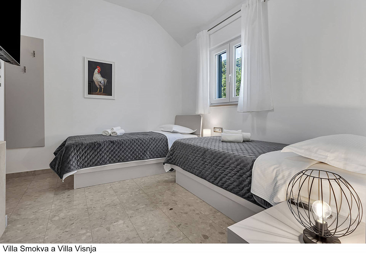 wille wynajmowane są jako całość dla większej liczby gości, Villa Smokva – 3 sypialnie z łóżkiem małżeńskim lub dwoma oddzielnymi łóżkami, pokój dzienny z kuchnią i rozkładaną kanapą dla dwójki dzieci do nieukończonych 18 lat, 2 łazienki z prysznicem, jedna oddzielna toaleta, Villa Visnja – 3 sypialnie z łóżkiem małżeńskim lub dwoma oddzielnymi łóżkami, pokój dzienny z kuchnią, 2 łazienki z prysznicem, wspólny taras z częścią wypoczynkową i grill, wspólny prywatny basen z leżakami i parasolami