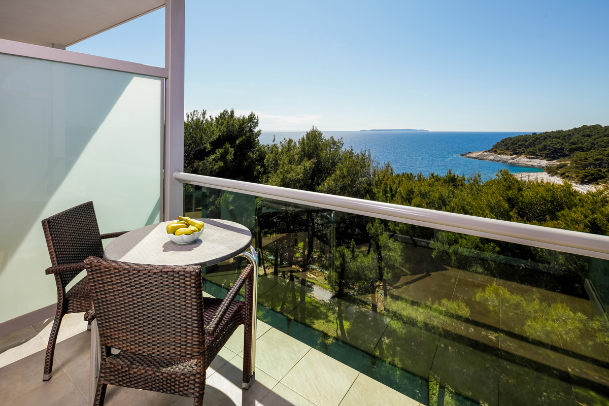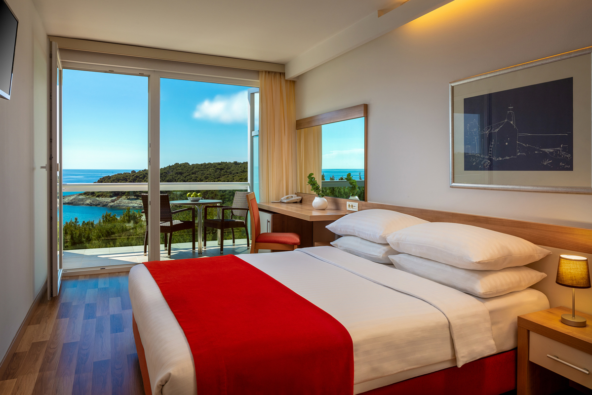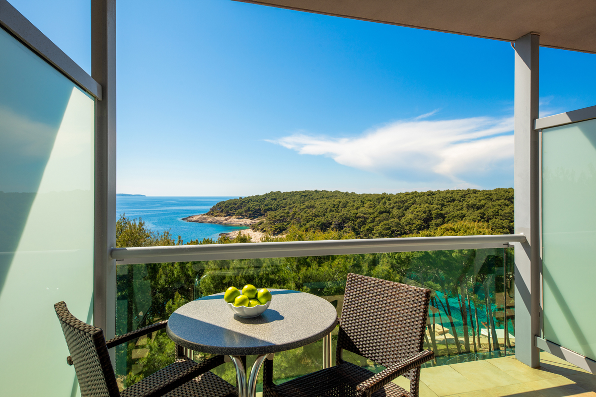 Suite 4 moře - 37 m², pokój z łóżkiem małżeńskim lub 2 pojedyńczymi łóżkami z możłiwościa 2 dostawek w formie rozkładnaej kanapy (180x185 cm), łazienka z wanną lub prysznicem, balkon z widokiem na morze