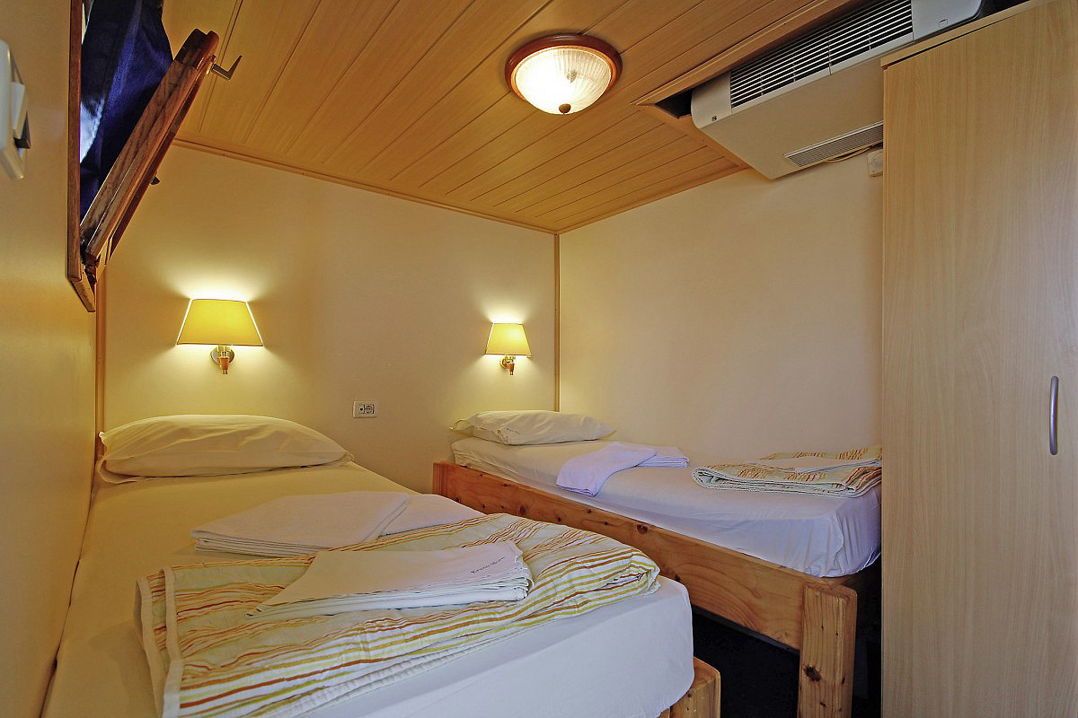 kabina z łóżkiem piętrowym lub łóżkiem francuskim, prywatna łazienka z prysznicem i toaletą, opis dotyczy również Comfort plus 1