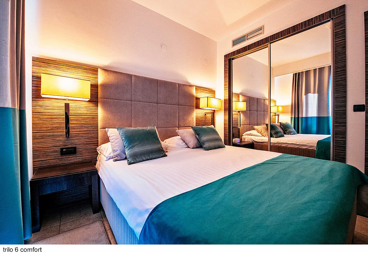 ok. 56 m² - 1 sypialnia z łóżkiem małżeńskim, 1 sypialnia z oddzielnymi łóżkami, pokój dzienny z aneksem kuchennym i możliwością dostawki, 2 łazienki, balkon lub taras (apartament może znajdować się w piętrze lub na 1. piętrze)