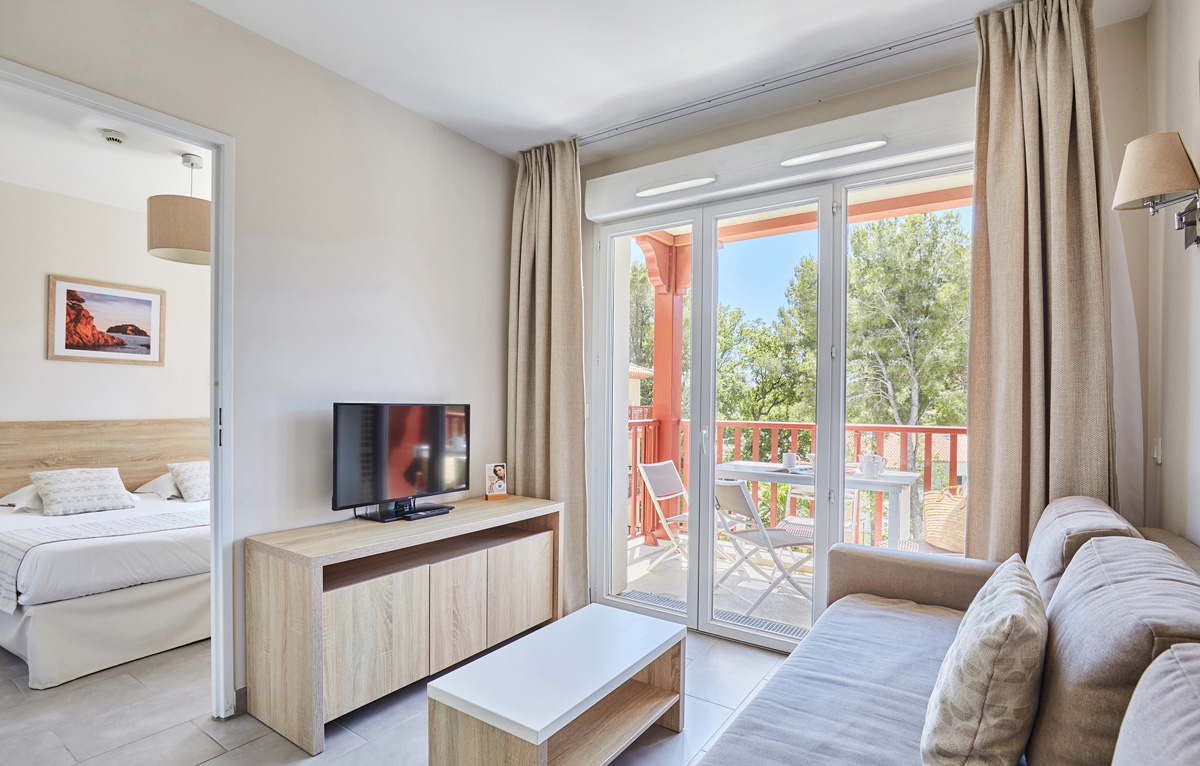 28 m² - 1 sypialnia z łóżkiem małżeńskim lub osobnymi łóżkami, salon z aneksem kuchennym i rozkładaną sofą dla 2 osób (możliwość rozłożenia do 2 osób), łazienka z prysznicem, taras lub balkon