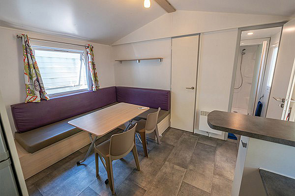 34 m² - sypialnia z łóżkiem małżeńskim, 2 sypialnie z 2 łóżkami pojedynczymi lub łóżkiem piętrowym, salon z aneksem kuchennym, łazienka z prysznicem, osobna toaleta, częściowo zadaszony taras