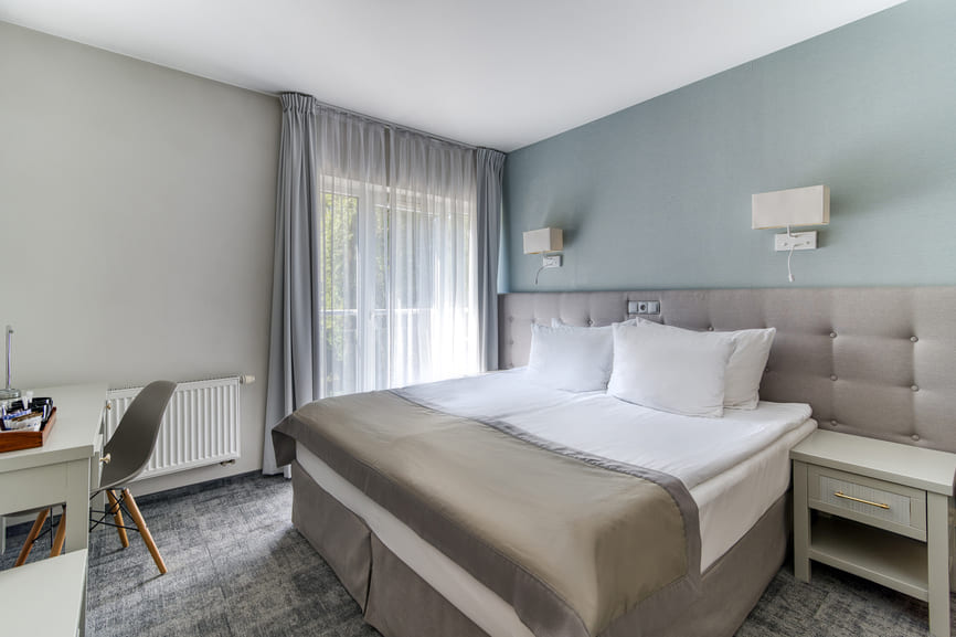 18 m² – pokój z łóżkiem małżeńskim lub 2 oddzielnymi łóżkami, z możliwością 1 dostawki, łazienka