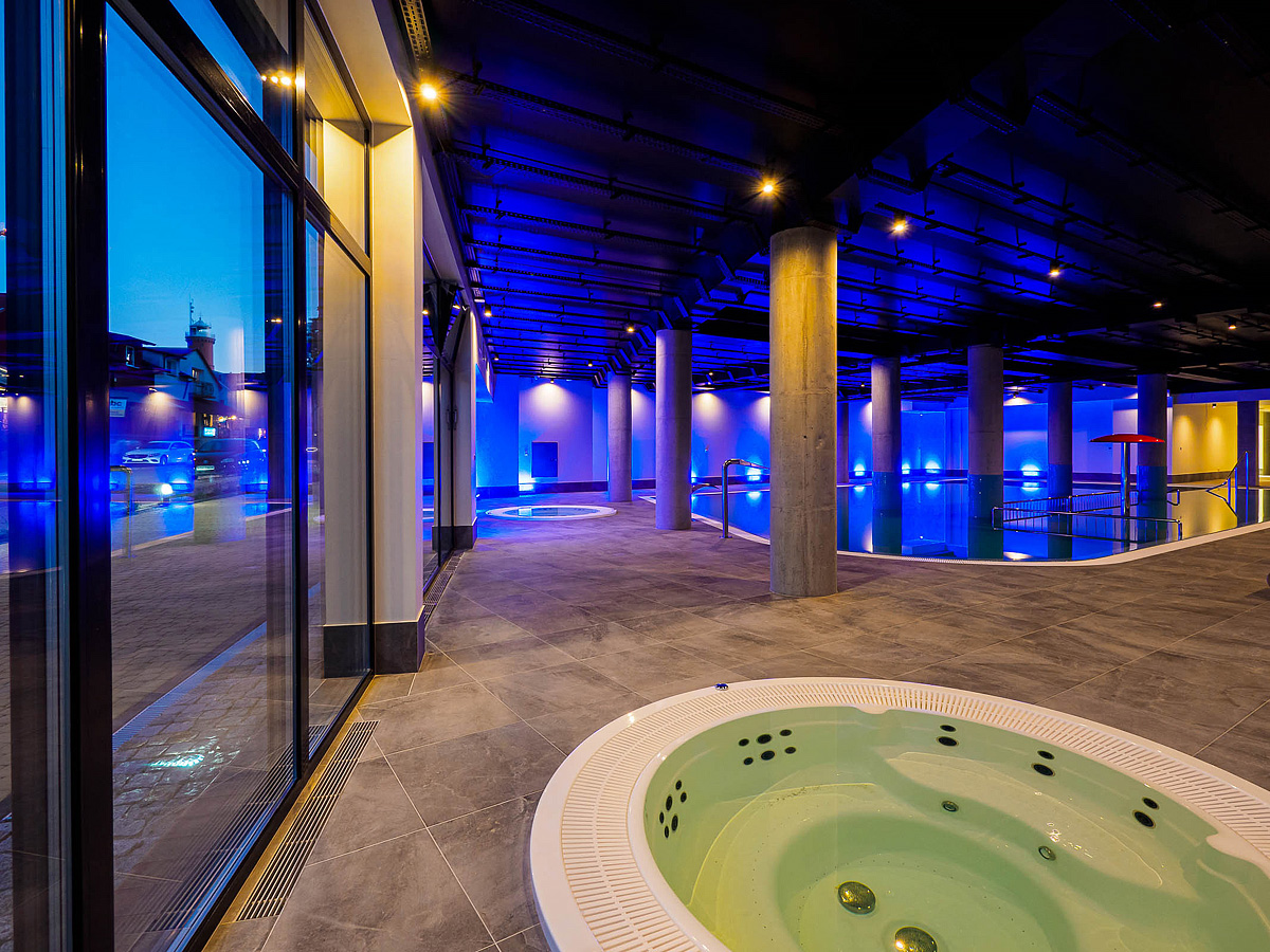 basen 20 x 14 m, łaźnia parowa#, sauna#, sauna fińska#, kabina na podczerwień#, jacuzzi#, grota solna*#, masaże*, usługi kosmetyczne*, szeroka gama zabiegów leczniczych i regeneracyjnych*, kącik relaksacyjny i ogród z leżakami, siłownia#, usługi oznaczone # mogą być wykorzystywane przez dzieci od 16 roku życia