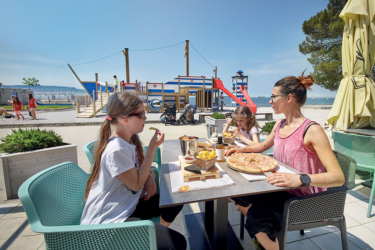 Zajęcia na świeżym powietrzu: odkryty basen olimpijski z wodą morską położony tuż przy wybrzeżu (czynny od ok. 15.6. do 15.9. w zależności od pogody), bezpłatne leżaki przy basenie, przestronna plaża z pomostami i betonowymi płytami, a także trawiastymi, zacienionymi zakątkami, kamieniste dno morza i bezpieczna, płytka woda są idealne do zabawy dzieci w wodzie, leżaki* i parasole*, pływający park wodny dla dzieci z dmuchanymi elementami*, piaszczyste boisko do siatkówki plażowej*, minigolf, kort do tenisa stołowego, korty tenisowe*, minigolf (18 dołków)*, wielofunkcyjne boisko sportowe*, sporty wodne na plaży (kajaki, rowery wodne itp.)* i nurkowanie*, wypożyczalnia rowerów*, jazda konna*, oddzielna plaża dla psów (jednak psy są dozwolone tylko w niektórych ilościach po wcześniejszym zgłoszeniu)