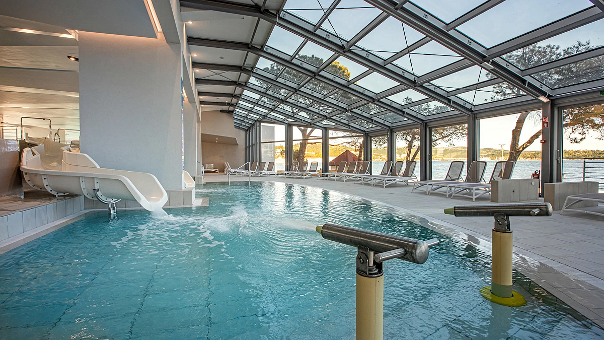 Kryty basen z wodą morską w hotelu Histrion, basen zewnętrzny, brodzik dla dzieci i dostęp do plaży w hotelu Vile Park (goście apartamentów mają bezpłatny dostęp do basenów)