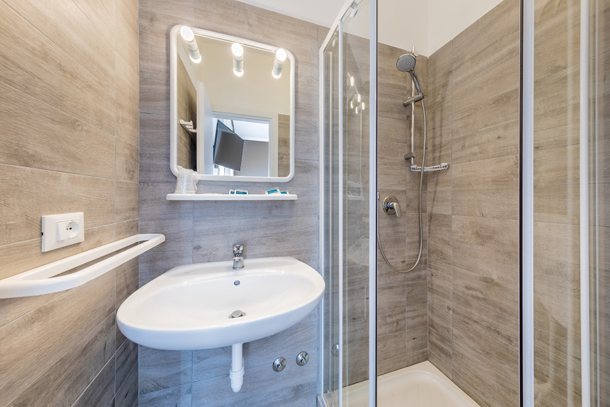 12 do 14m² - pokój z łożkiem małżeńskim, łazienka z prysznicem, balkon; możliwość 3 i 4 łóżka; pokoje czteroosobowe z łóżkami piętrowymi.
