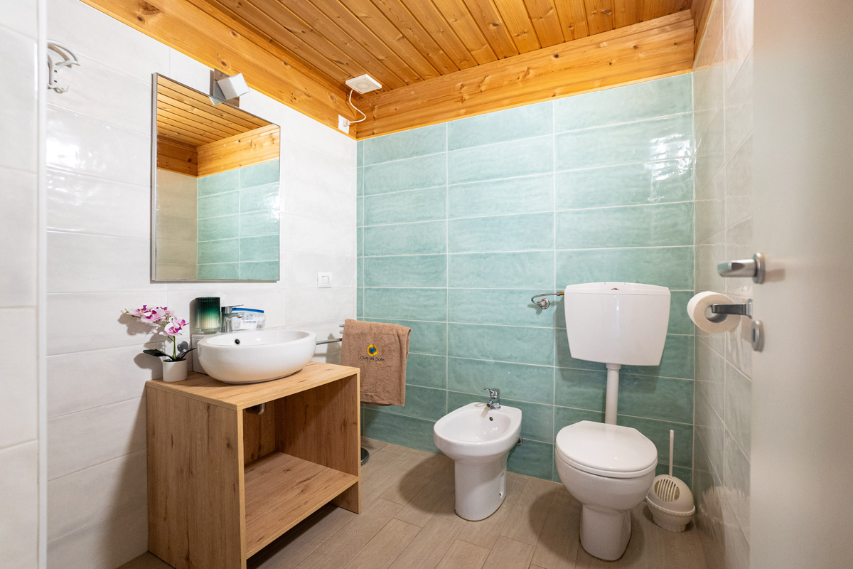 32 m² – sypialnia z łóżkiem małżeńskim, sypialnia z 2 łóżkami pojedynczymi, salon z aneksem kuchennym i rozkładaną sofą dla 2 osób, 2 łazienki z prysznicem, zadaszony taras drewniany