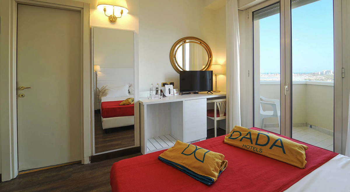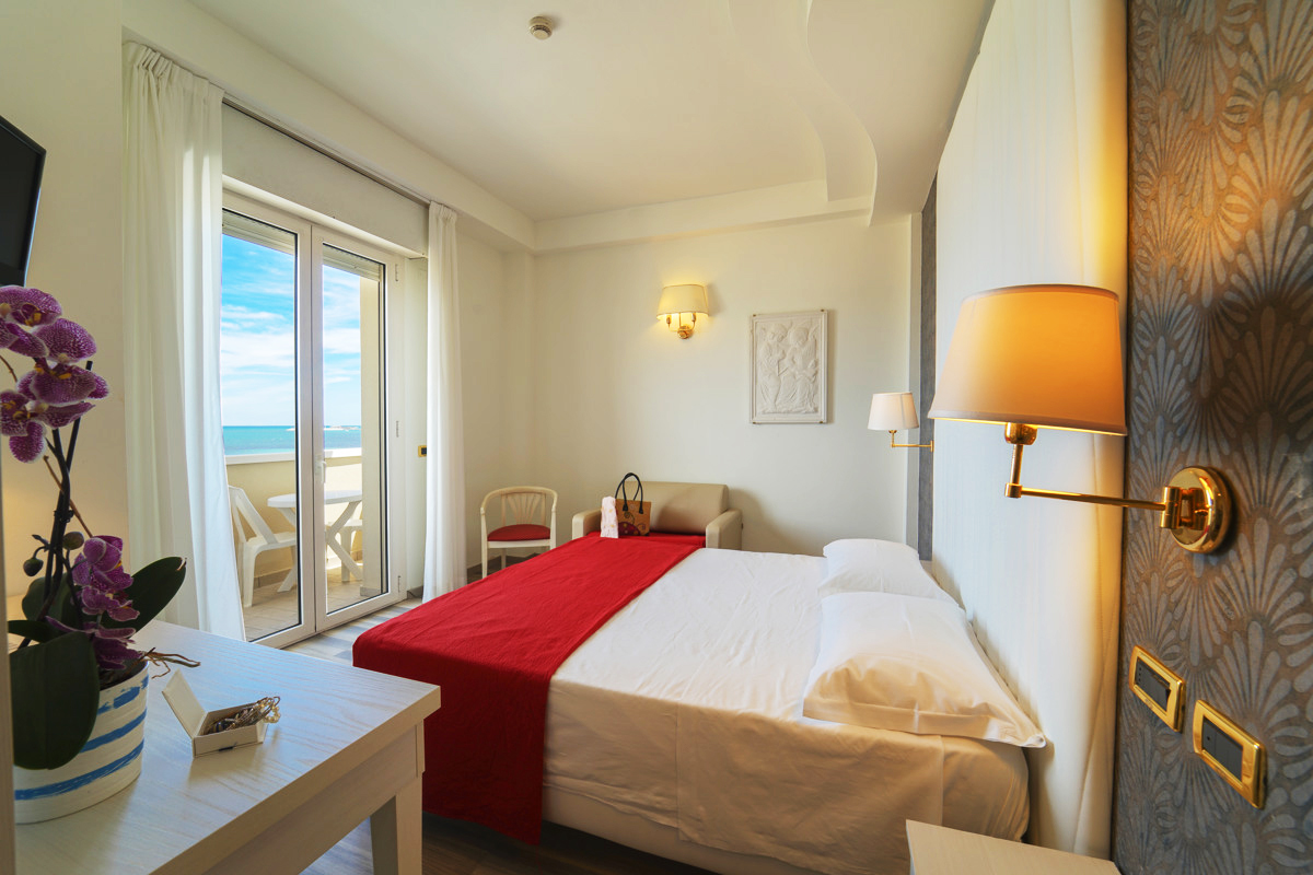 pokój z łóżkiem małżeńskim lub 2 pojedynczymi łóżkami, łazienka z prysznicem, balkon z bezpośrednim widokiem na morze
