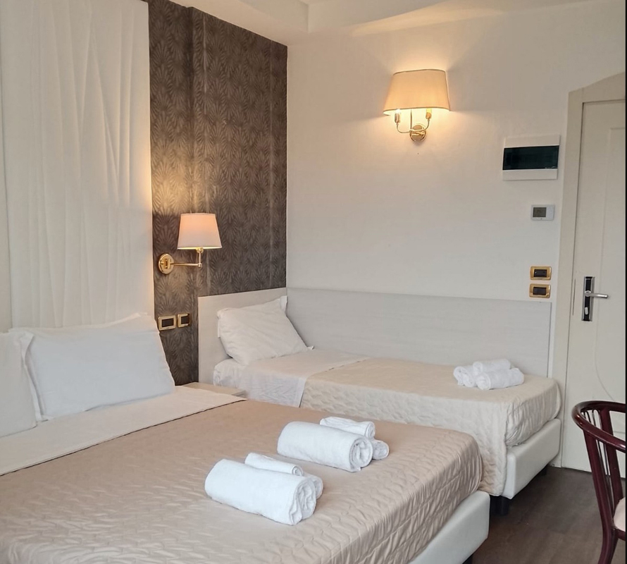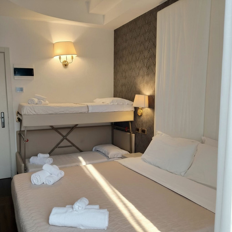 pokój z łóżkiem małżeńskim lub dwoma pojedynczymi łóżkami, łazienka z prysznicem, zazwyczaj balkon z bocznym widokiem na morze; 3. łóżko w formie dostawki, 4. łóżko zawsze piętrowe