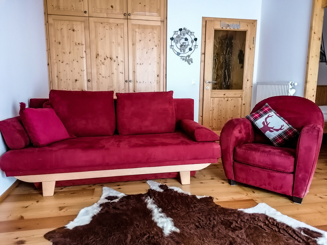 88 m² - parter apartamentu: sypialnia z łóżkiem małżeńskim, dodatkowym łóżkiem pojedynczym i rozkładaną sofą dla 2 osób, łazienka; I piętro apartamentu: sypialnia z łóżkiem małżeńskim, salon z aneksem kuchennym i rozkładaną sofą dla 1 osoby, łazienka, osobna toaleta, balkon
