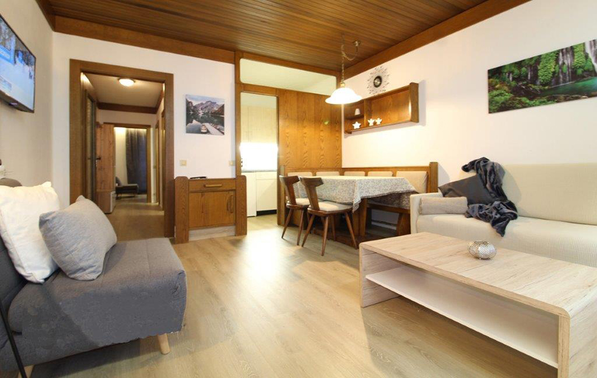 57-59 m² - sypialnia z 2 oddzielnymi łóżkami, salon z aneksem kuchennym i rozkładaną sofą dla 2 osób, łazienka z prysznicem lub wanną, korytarz, balkon