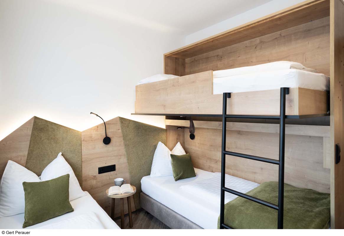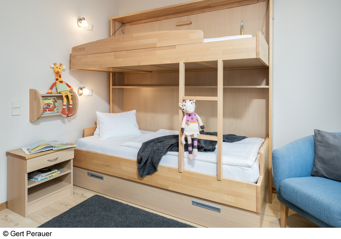 30-35 m² - pokój z nietypowym łóżkiem piętrowym, salon z łóżkiem małżeńskim, łazienka, balkon; minimalna liczba osób w pokoju to 2 osoby dorosłe i 2 dzieci od 6 lat