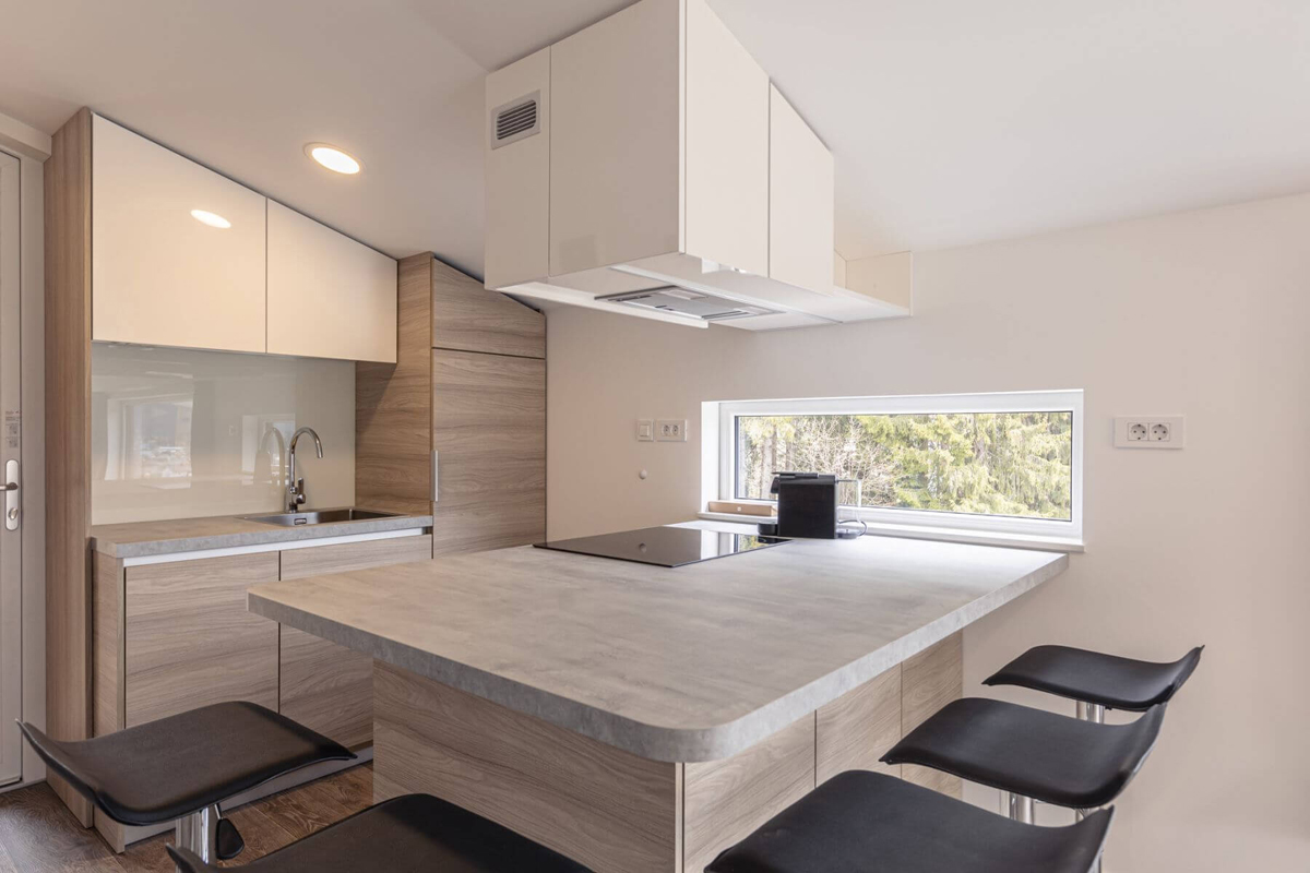 Baumhaus 2+1 - 22,5 m² - salon z aneksem kuchennym, łóżkiem małżeńskim i rozkładaną sofą dla 1 dziecka do lat 13, łazienka, taras; apartament stoi na wysokich filarach, dostęp do niego możliwy jest wyłącznie po schodach