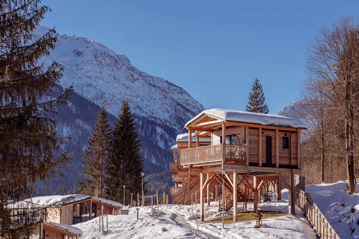 • Wioska wakacyjna z domkami i nietypowymi apartamentami na wysokich filarach z zapierającym dech w piersiach widokiem na okolicę
