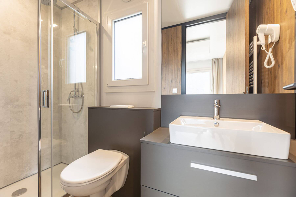 Chalet 6 - 60 m² - 3 sypialnie z łóżkiem małżeńskim lub 2 łóżkami pojedynczymi lub łóżkiem piętrowym dla 2 osób (zwykle 1 łóżko małżeńskie, 1 łóżko piętrowe i 1 sypialnia z 2 łóżkami pojedynczymi), salon z aneksem kuchennym, łazienka, osobna toaleta, taras