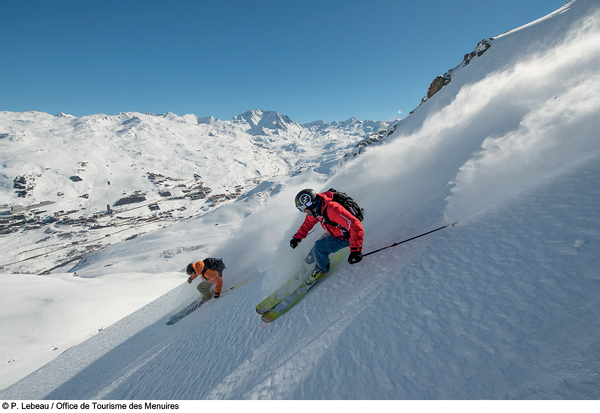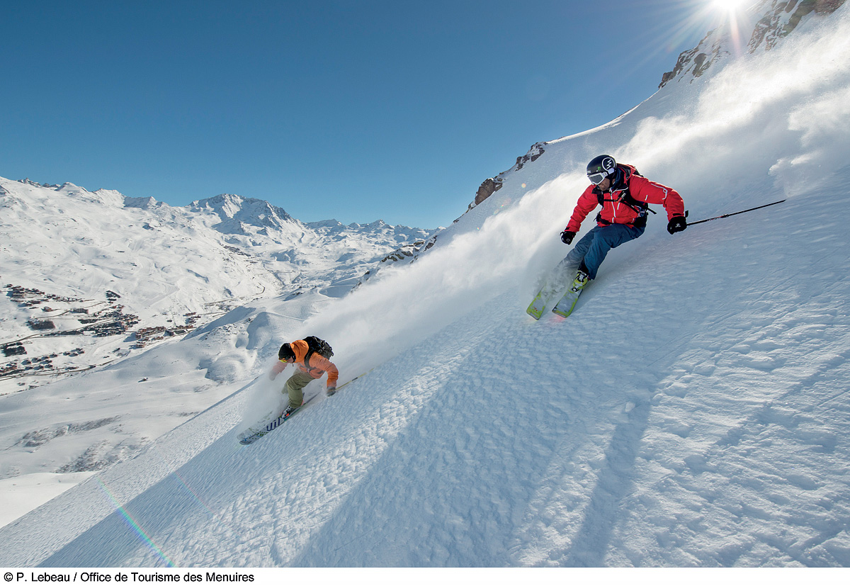 Największą pokusą dla wymagających narciarzy są nartotrasy Combe Vallon z długością 2,8 km i przechyleniem 794 m, albo Les Bosses z długością 1 km i przechyleniem 350m. Według lokalizacji nartotras na wschodnich i zachodnich stokach jest tu możliwość jazdy na nartach przez cały dzień na słońcu. Ciekawe jest połączenie kolejką linową ze znanym miastem uzdrowiskowym Brides-les-Bains. Wieczorna jazda na nartach w cenie skipaszportu, snowpark z jakościowym halfpipe albo strefą dla początkujący jest kolejnym z wielu bonusów tego ośrodku. Lodowisko Igrzysk Olimpijskich w Méribel oferuje dzisaj oprócz lodowiska i basen, kort na squasch, kręgle, sztuczną ścianę wspinaczkową, siłownie, studio tańca i salon z masażem.