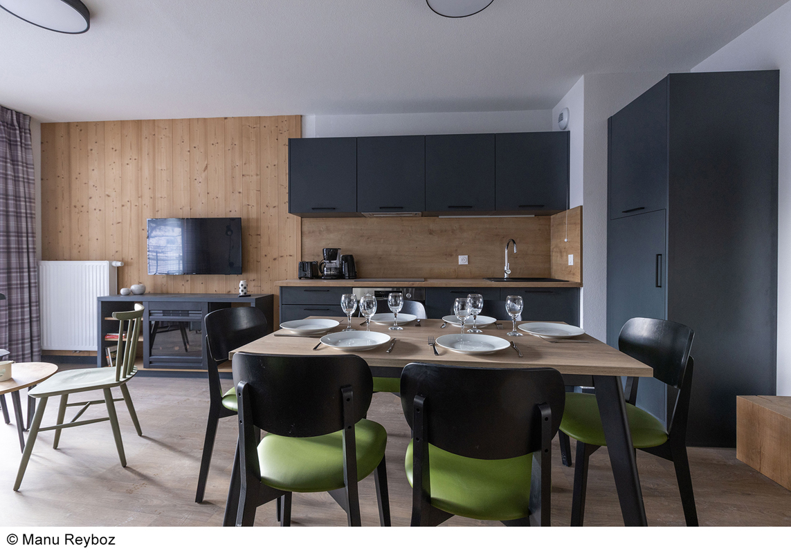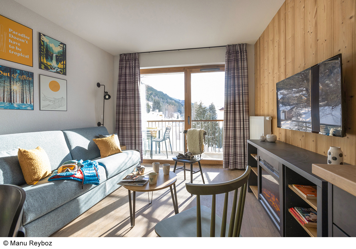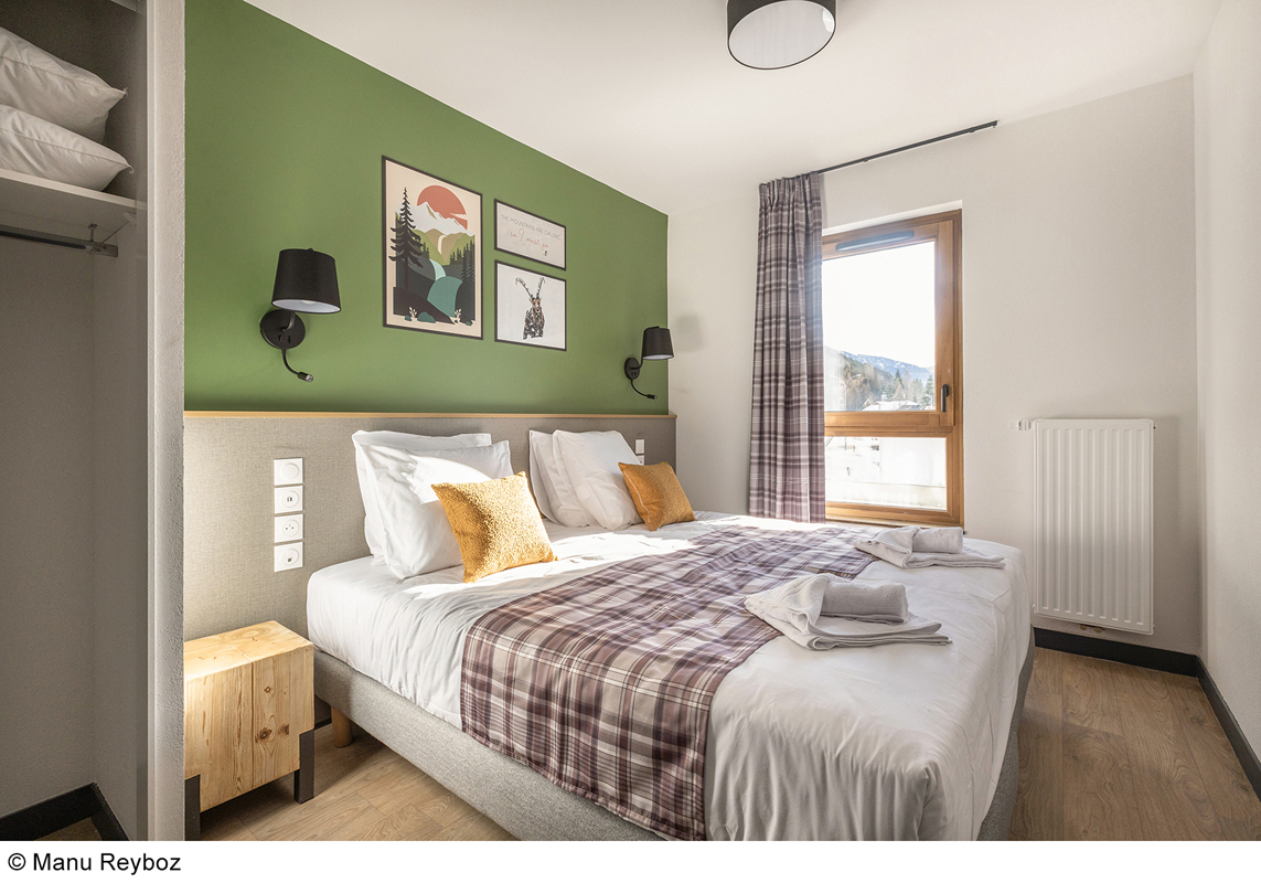 62 m² - 2 sypialnie z 2 pojedynczymi łóżkami (możliwość połączenia w łóżko podwójne), 1 sypialnia z 2 pojedynczymi łóżkami lub łóżkiem piętrowym, salon z aneksem kuchennym, ozdobnym kominkiem i rozkładaną sofą dla 2 osób (możliwa również sofa typu „szuflada”), 2 łazienki (1 z prysznicem, 1 z wanną, 1 bez toalety), balkon