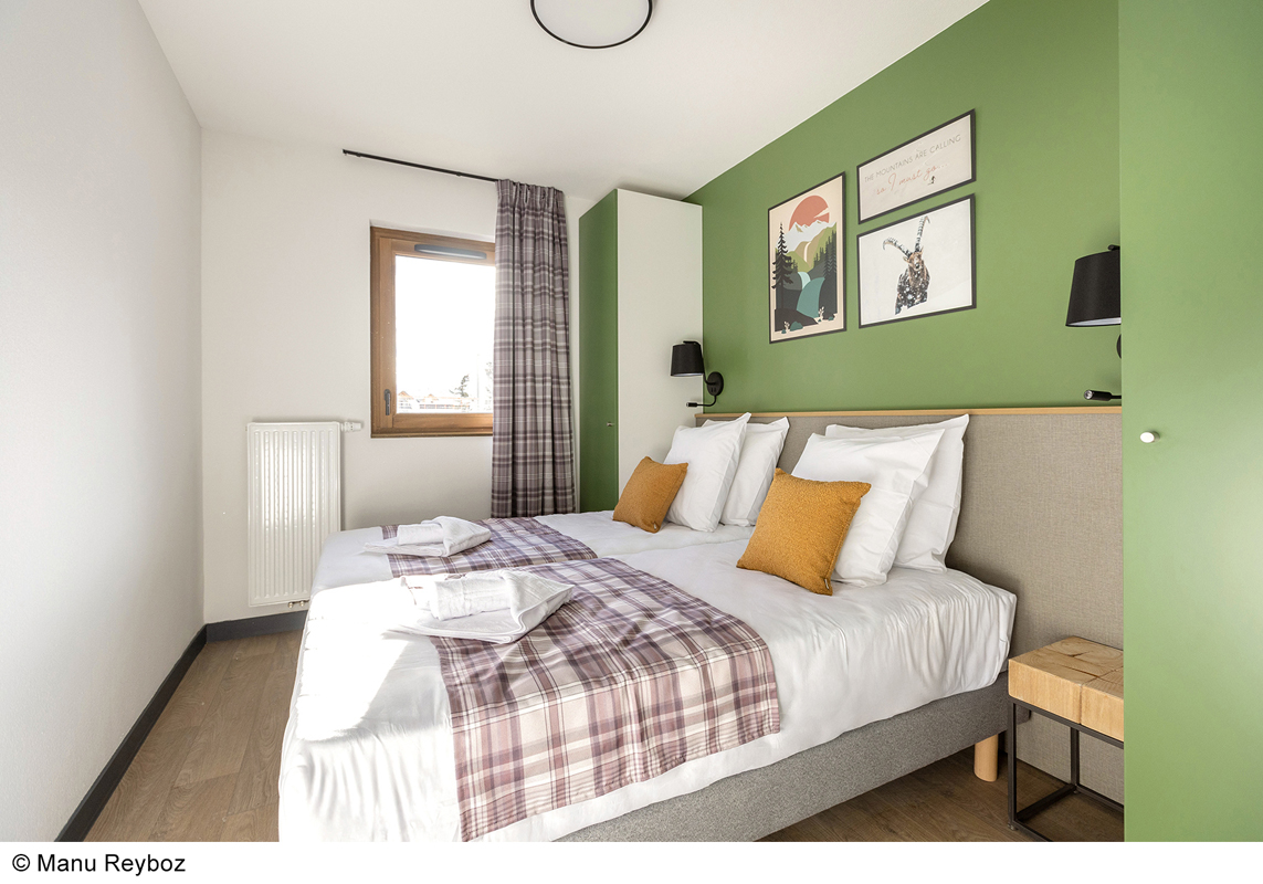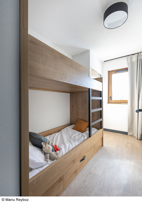 44 m² - 1 sypialnia z 2 pojedynczymi łóżkami (można je połączyć w łóżko podwójne), 1 sypialnia z łóżkiem piętrowym, salon z aneksem kuchennym i rozkładaną sofą dla 2 osób (możliwa również sofa typu „szuflada”), 2 łazienki (1 z prysznicem, 1 z wanną, 1 bez toalety), balkon