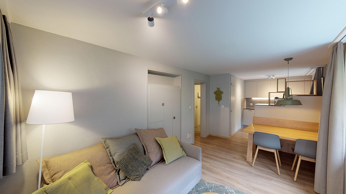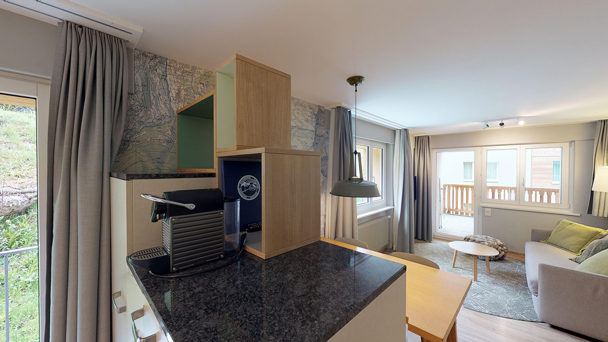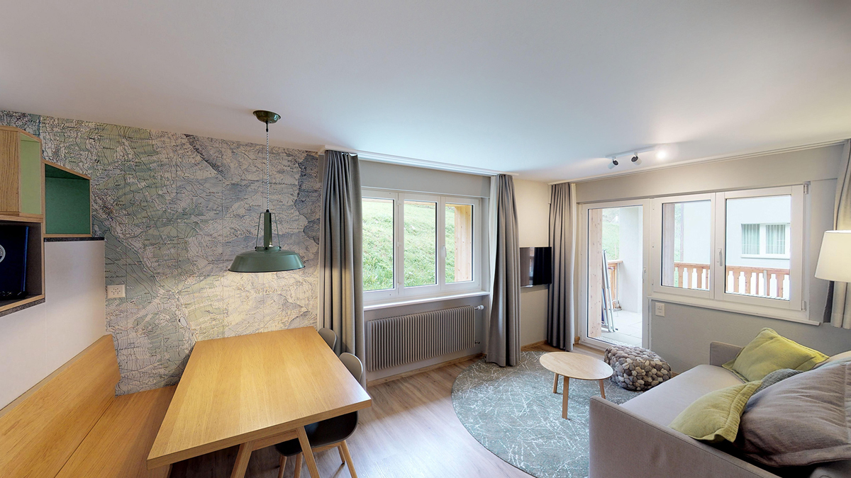 38 m² - sypialnia z 2 pojedynczymi łóżkami, salon z aneksem kuchennym i rozkładaną sofą dla 2 osób, łazienka, balkon; apartament zazwyczaj znajduje się na poddaszu ze skośnym dolnym sufitem