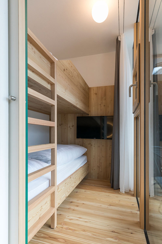 bilo 2+3 Panorama Suite Wellness - 81 m² - 1 sypialnia z 1 łóżkiem pojedynczym o długości 170 cm i łóżkiem piętrowym, salon z aneksem kuchennym i częściowo oddzielnym łóżkiem podwójnym, sauna fińska, 2 łazienki, balkon; w apartamencie mogą nocować maksymalnie 2 osoby dorosłe i 3 dzieci poniżej 18 lat