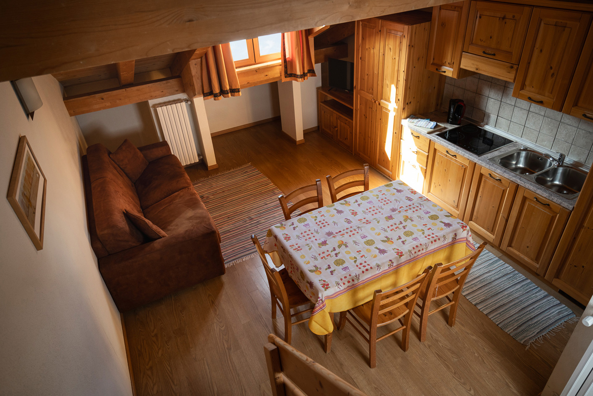 70 m² - 1 sypialnia z łóżkiem małżeńskim z osobnymi łóżkami i ewentualnie dodatkową rozkładaną sofą, salon z aneksem kuchennym i rozkładaną sofą dla 2 osób, łazienka z prysznicem; 1 apartament na 1 piętrze z balkonem i 1 na poddaszu bez balkonu