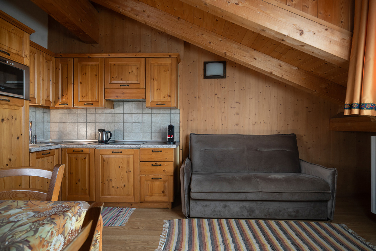 31 m² - salon z aneksem kuchennym, rozkładaną sofą dla 2 osób i łóżkiem piętrowym, łazienka zazwyczaj z prysznicem; apartament znajduje się na poddaszu i nie posiada balkonu