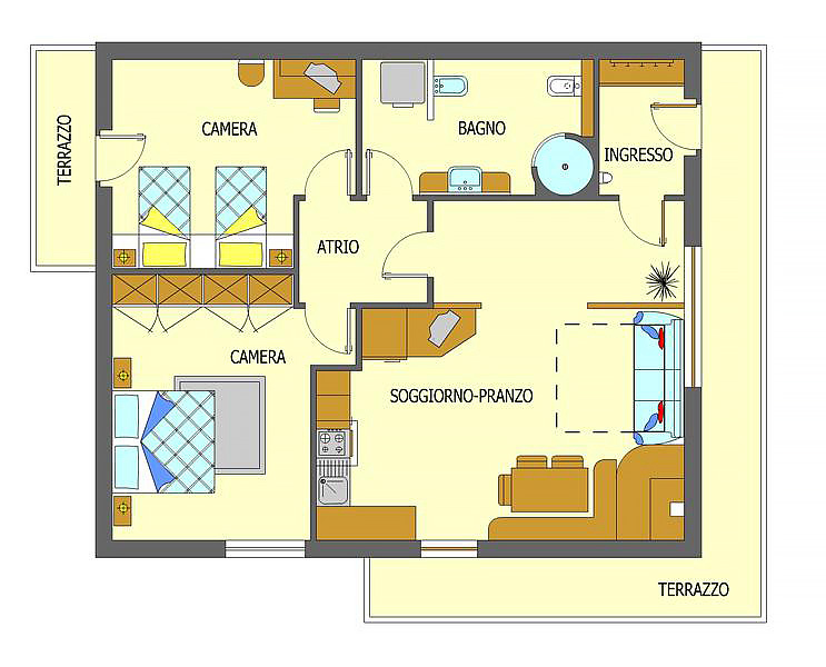 1 sypialnia z łóżkiem małżeńskim, 1 sypialnia z łóżkiem małżeńskim z możliwością rozdzielenia łóżek, pokój dzienny z aneksem kuchennym i rozkładaną kanapą dla 2 dzieci do nieukończonych 18 lat, łazienka, balkon lub ogródek