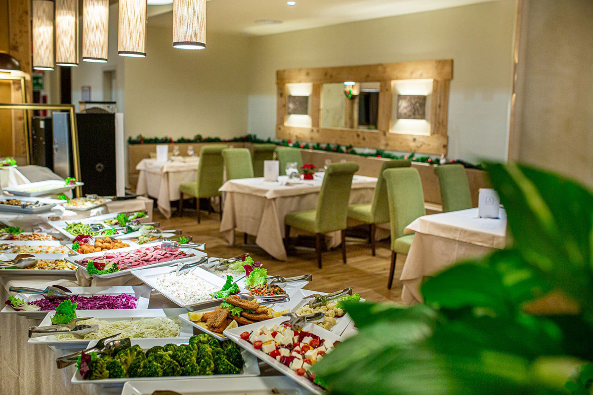 kolacja - menu serwowane z wyborem 3 gorących przystawek i 3 dań głównych z dodatkiem, bufetem sałatkowym, serwowanym deserem, wodą (0,5 l) i winem stołowym (0,25 l), inne napoje za opłatą