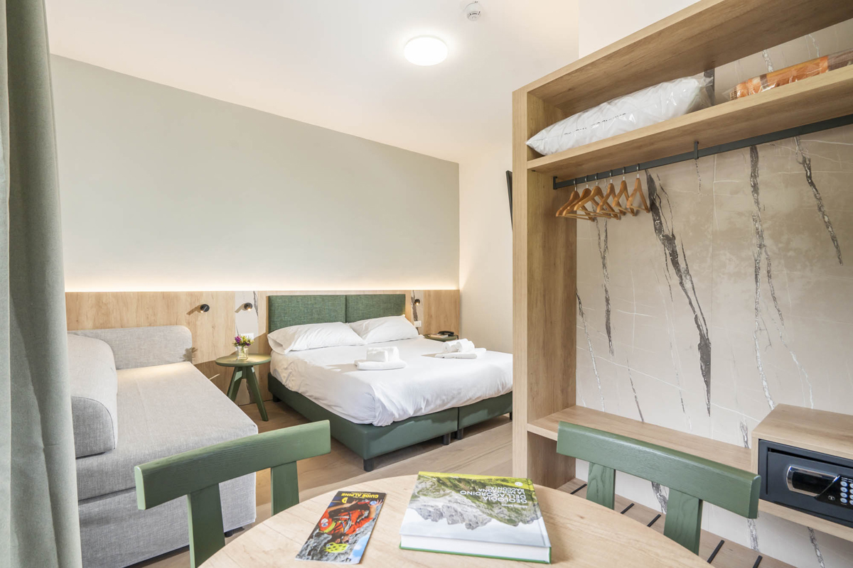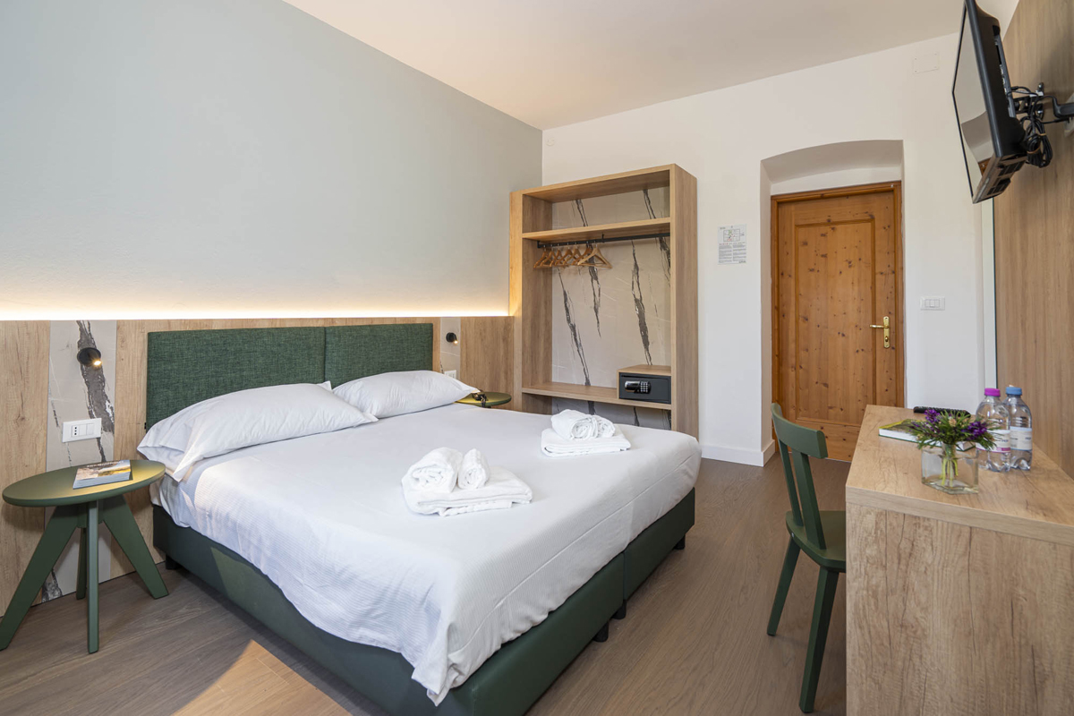 15 - 19 m² - pokój z łóżkiem małżeńskim lub 2 pojedynczymi łóżkami i ewentualnie 1 kolejnym łóżkiem pojedynczym, łazienka; pokoje znajdują się w głównym budynku, rzadko balkon