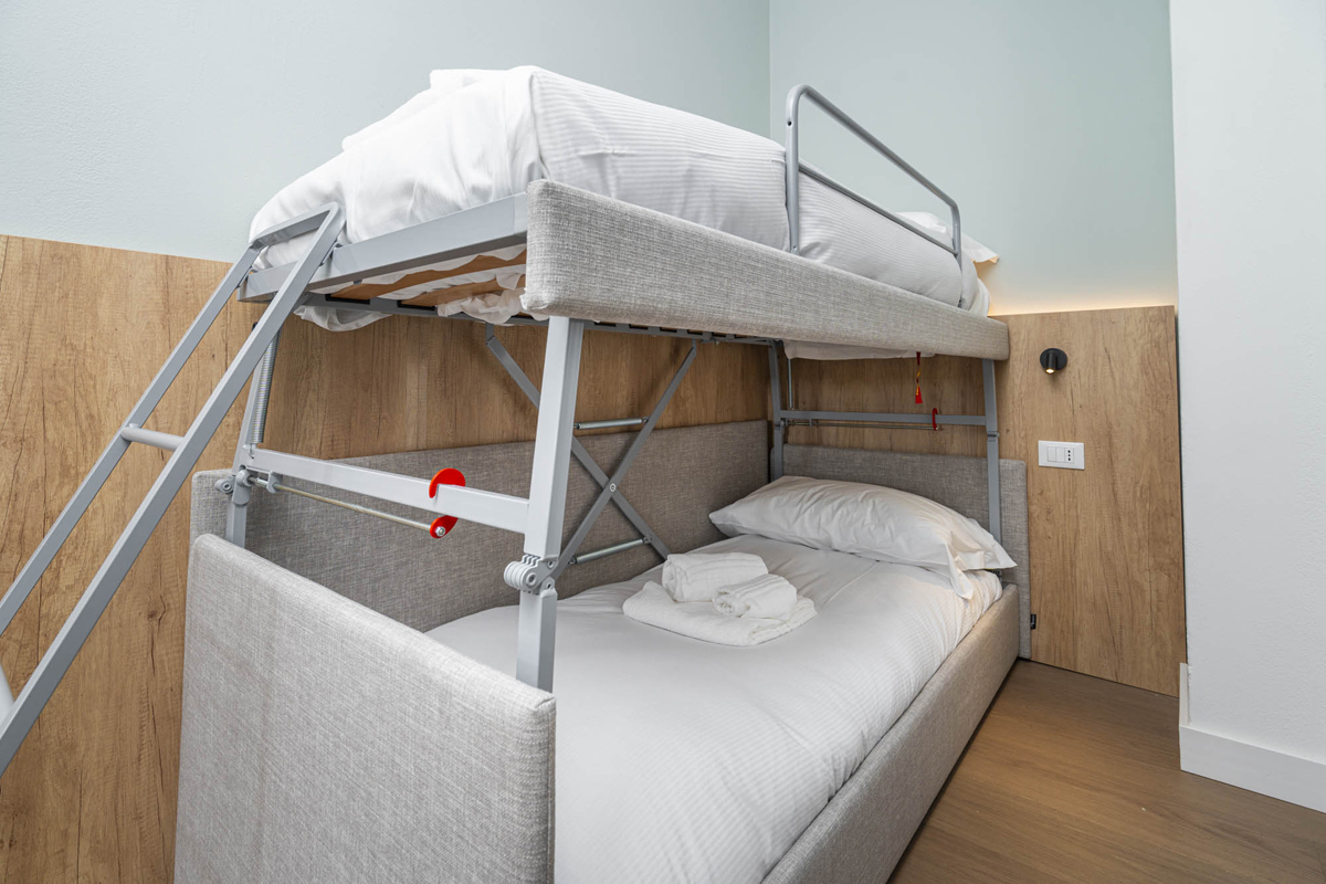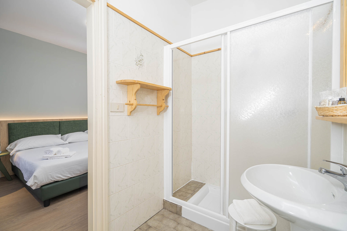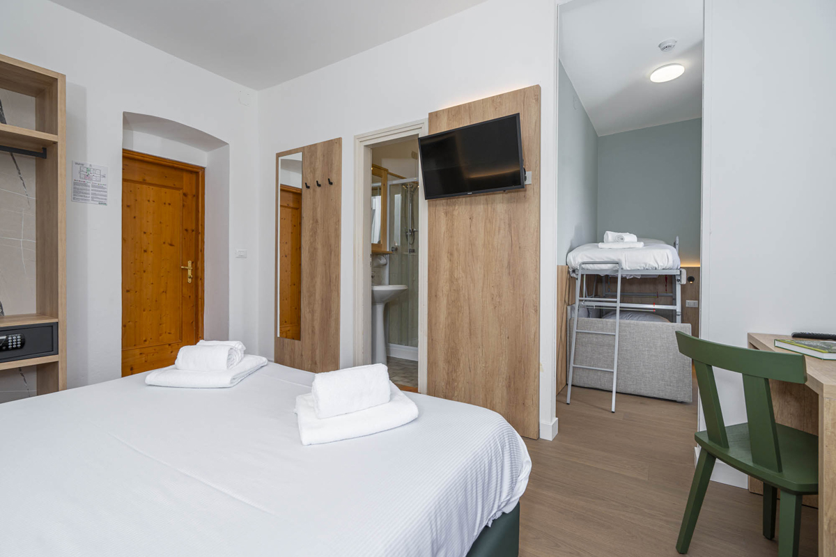 14 m² - pokój z łóżkiem małżeńskim lub 2 pojedynczymi łóżkami i ewentualnie 1 kolejnym pojedynczym łóżkiem lub kanapą rozkładaną na łóżko piętrowe, łazienka; pokoje znajdują się w budynku bocznym nr. 1