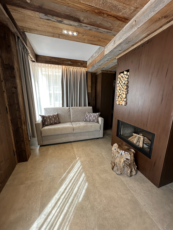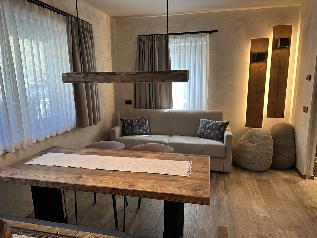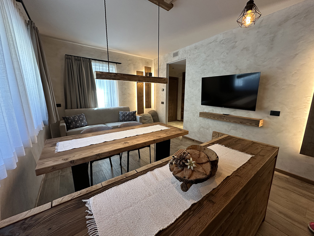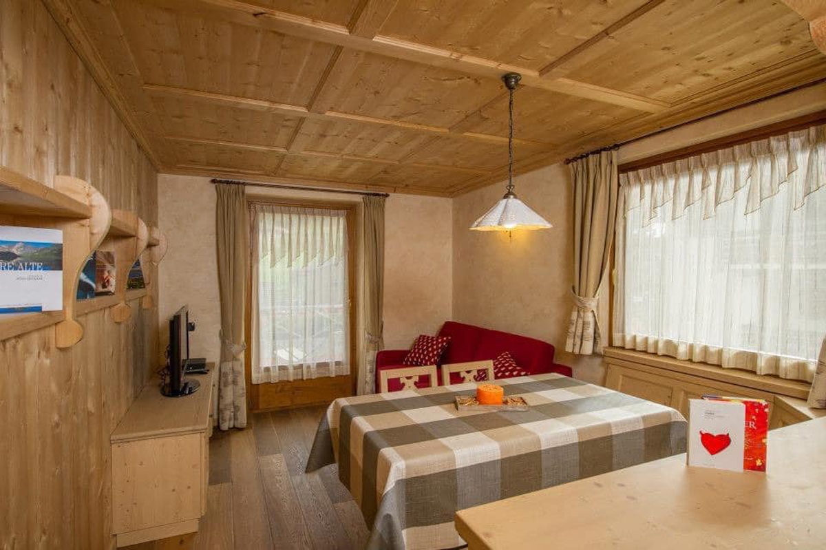 trilo 4+2 Stella Alpina - 62 m² – 1 sypialnia z łóżkiem małżeńskim, 1 mniejsza sypialnia z 2 łóżkami pojedynczymi, salon z aneksem kuchennym i rozkładaną sofą dla 2 osób (do 12 lat), łazienka z prysznicem, balkon; maksymalna liczba osób: 4 osoby dorosłe i 2 dzieci do 11,99 lat; apartament znajduje się na 1 piętrze