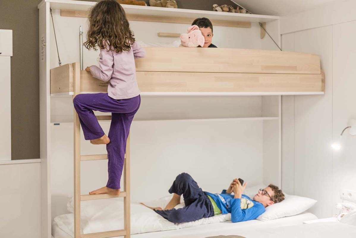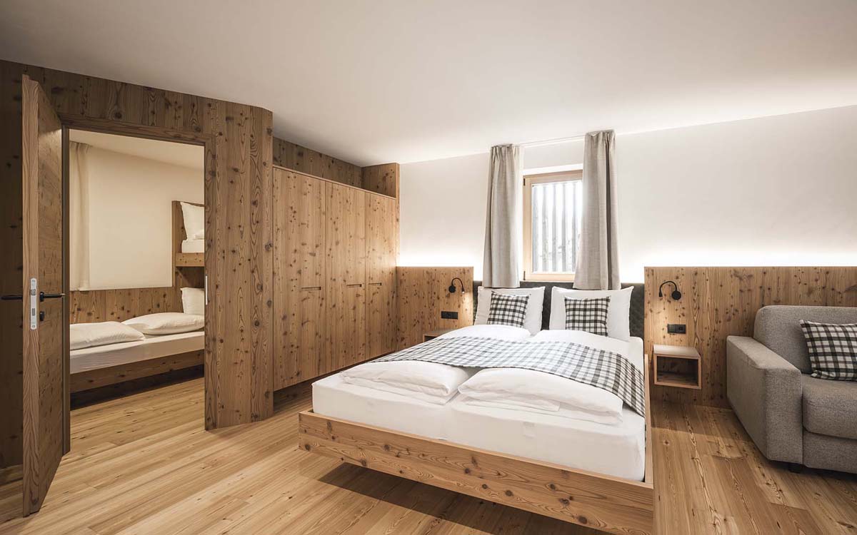 Junior Suite 2/3/4/5/6 - 35-45 m² - pokój z łóżkiem małżeńskim i 2 łóżkami pojedynczymi, pokój z rozkładaną sofą dla 2 osób lub 2 łóżkami piętrowymi, łazienka