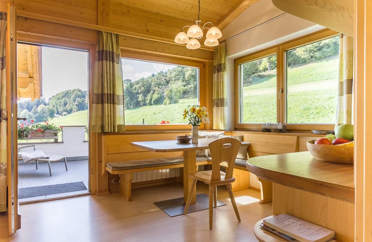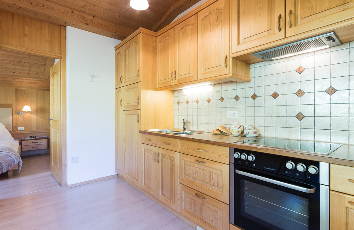 bilo 3 Dolomitenblick - 42 m² – 1 sypialnia z łóżkiem małżeńskim, pokój dzienny z aneksem kuchennym z rozkładana kanapą dla 1 osoby, łazienka, balkon (20 m²)