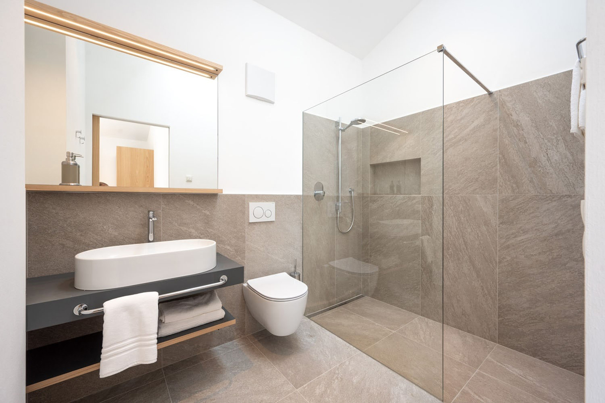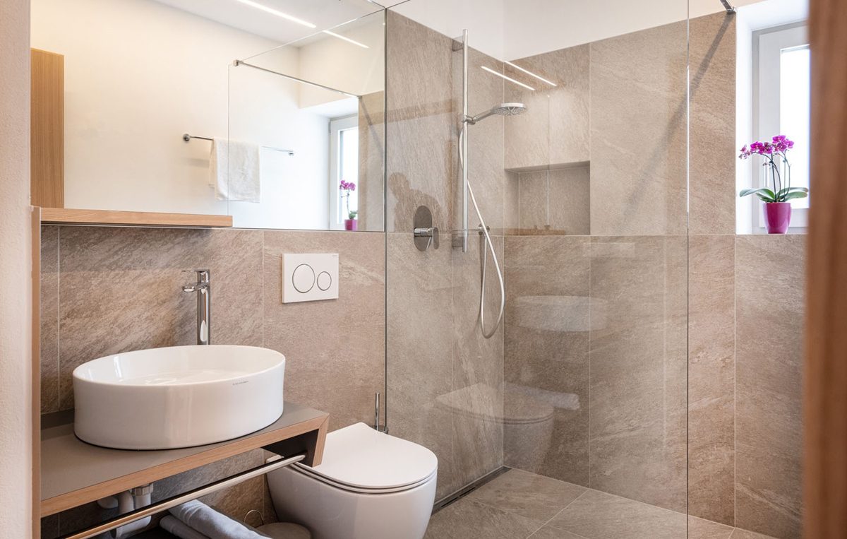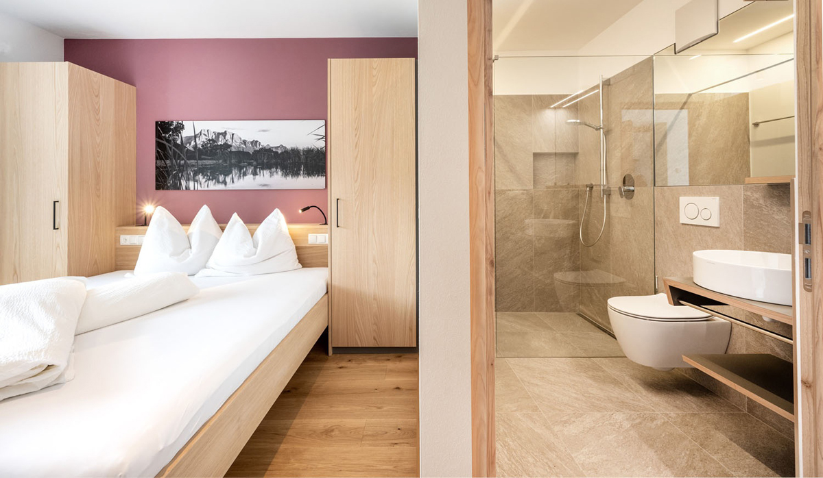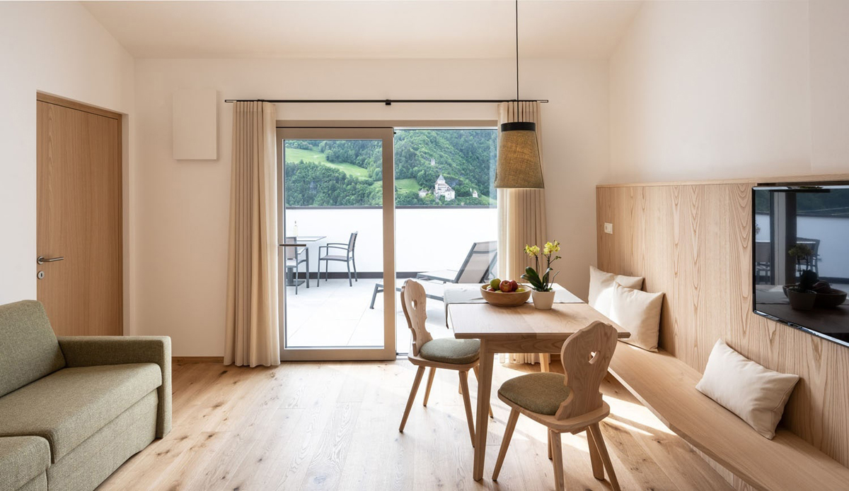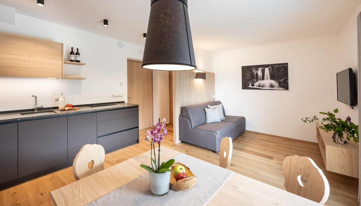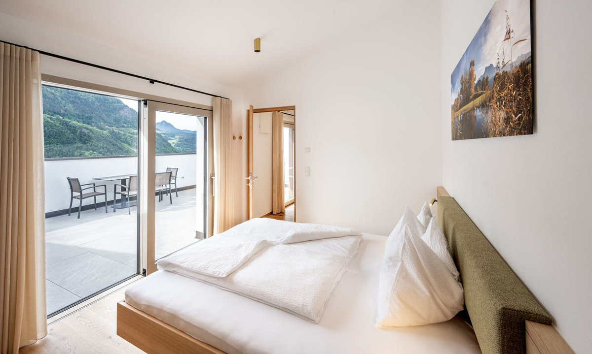 trilo 4 Vernatsch - 57 m² - 2 sypialnie z łóżkami małżeńskimi i prywatnymi łazienkami, salon z aneksem kuchennym, 1 balkon, duży taras (17 m²)