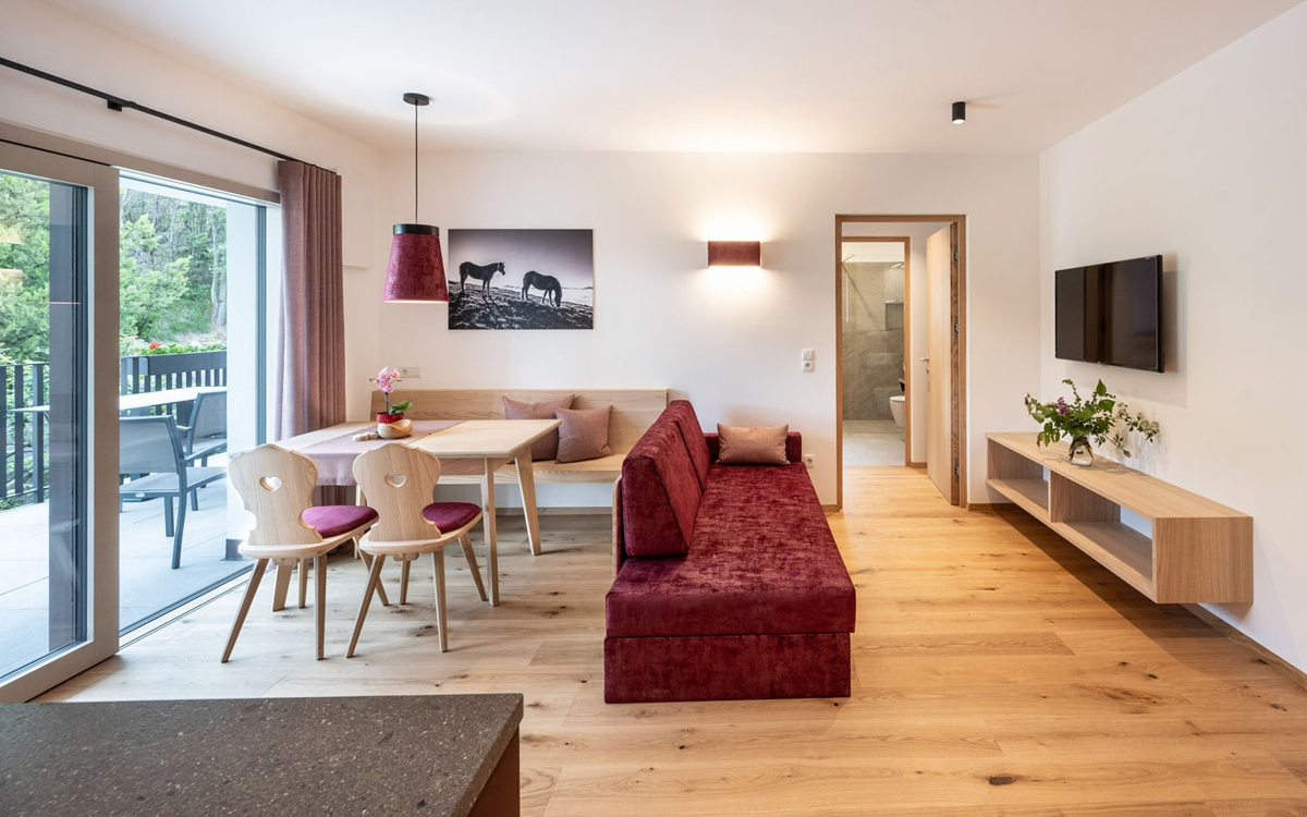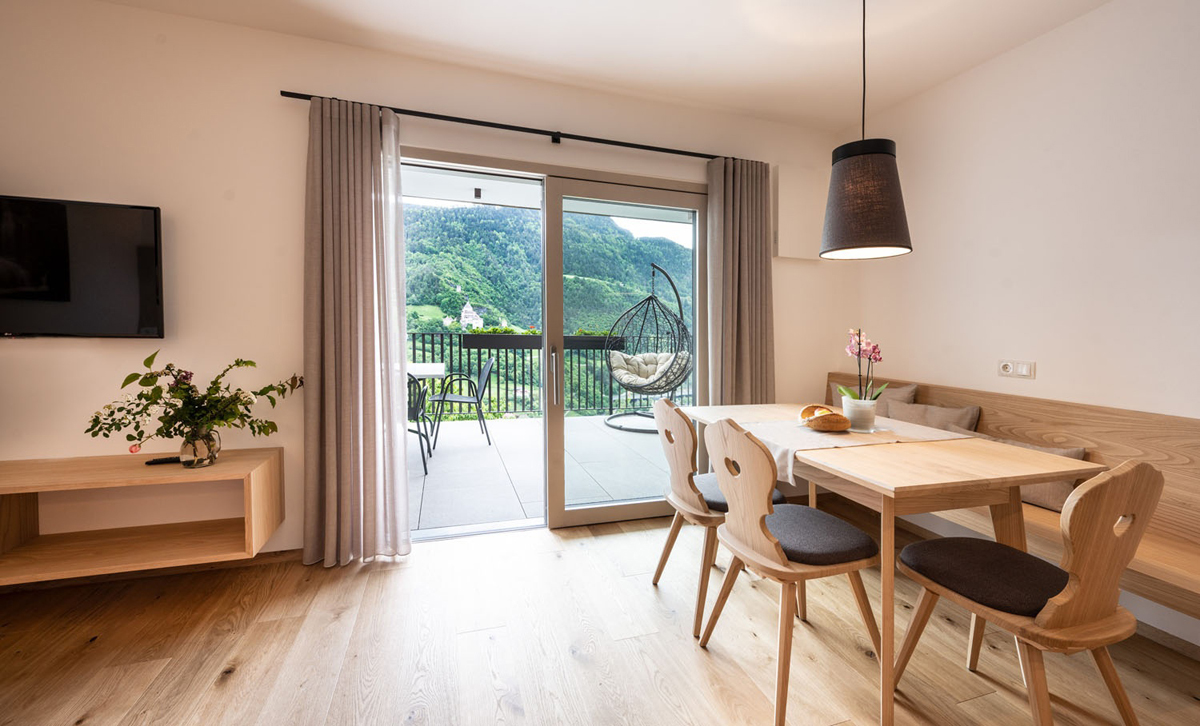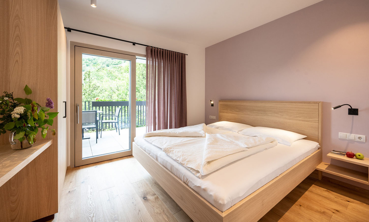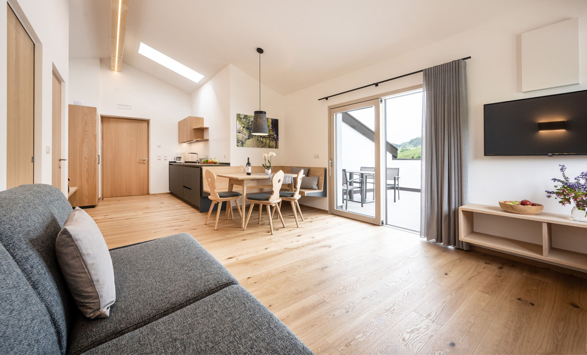 trilo 6 Blauburguder - 65 m² - 2 sypialnie z łóżkami małżeńskimi i prywatnymi łazienkami, salon z aneksem kuchennym i rozkładaną sofą dla 2 osób, balkon, duży taras (20 m²)