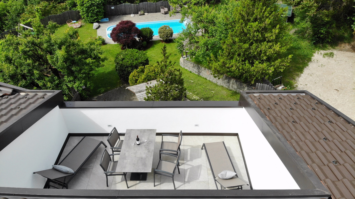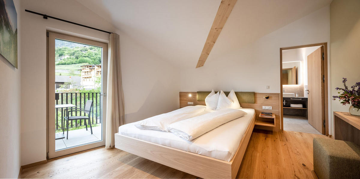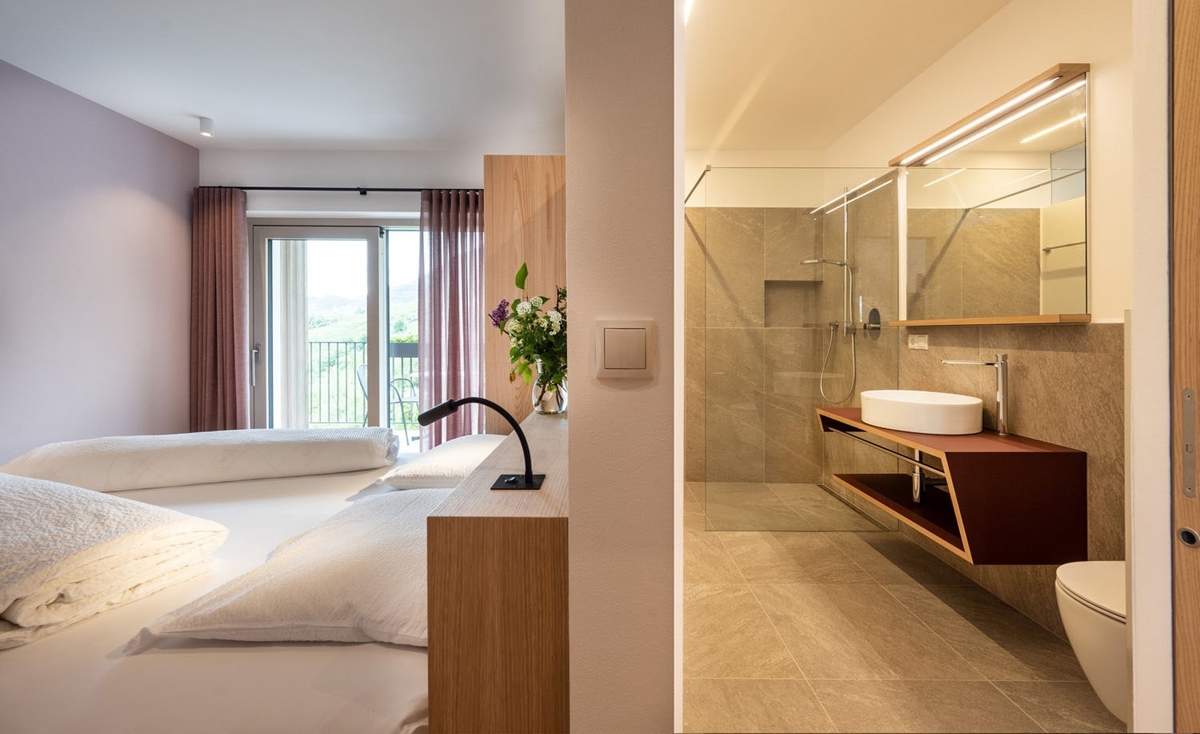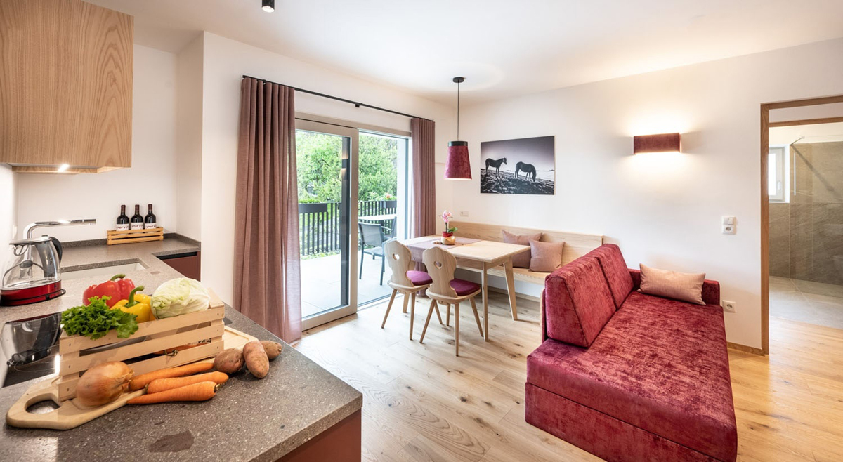 trilo 6 Blauburguder - 65 m² - 2 sypialnie z łóżkami małżeńskimi i prywatnymi łazienkami, salon z aneksem kuchennym i rozkładaną sofą dla 2 osób, balkon, duży taras (20 m²)