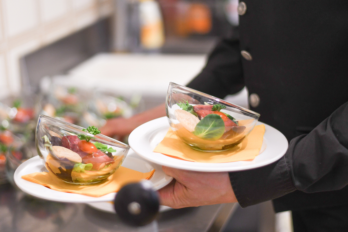 kolacja - menu serwowane (4 dania) - zupa, ciepła przystawka, danie główne (do wyboru wegetariańskie lub mięsne) oraz deser, bufet owocowo-sałatkowy, napoje za opłatą